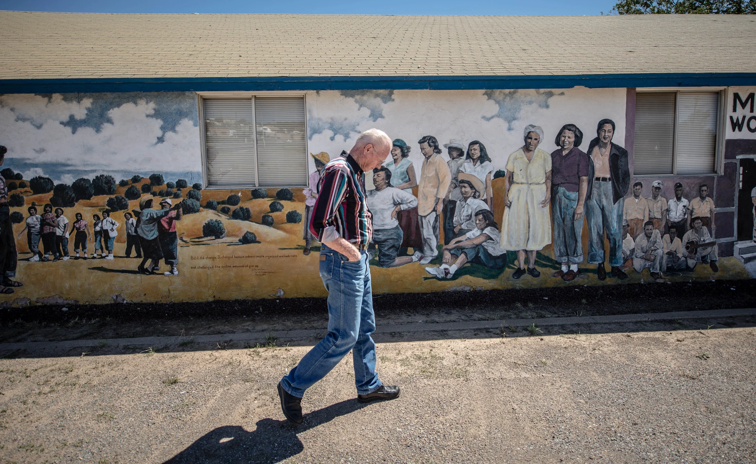 Terry Humble, 73, walks past the union hall in Bayard, which is covered inside and out with murals memorializing the Salt of the Earth strike, which won gains for Hispanic miners at the Empire Zinc Co. mine north of Bayard. (Roberto E. Rosales/Albuquerque Journal)