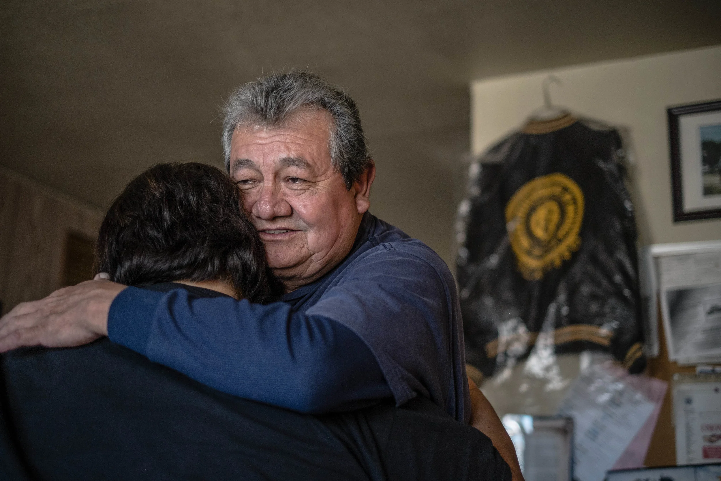 Ray Teran, a 40-year veteran of the Chino Mine, hugs Frances Gonzales, whose father was a longtime miner and union member. Teran was chairman of United Steelworkers Local 9424-3, which was decertified after a union election last month. (Roberto E. Rosales/Albuquerque Journal)